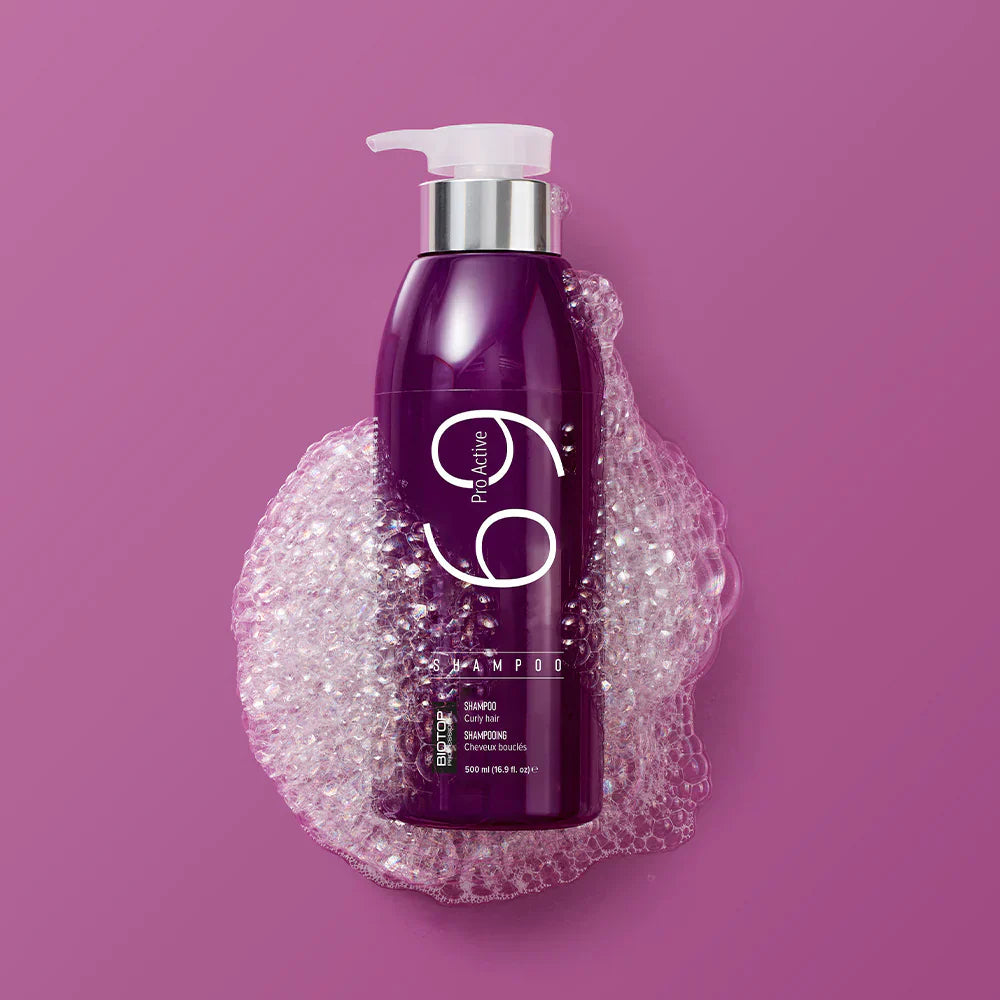 - Dispense 2-3 pumps of 69 Pro Active Shampoo into hands
