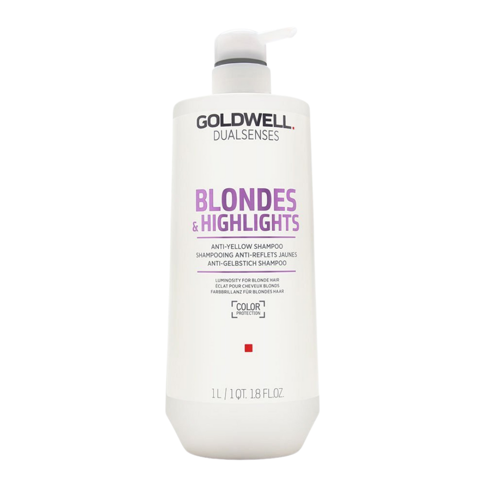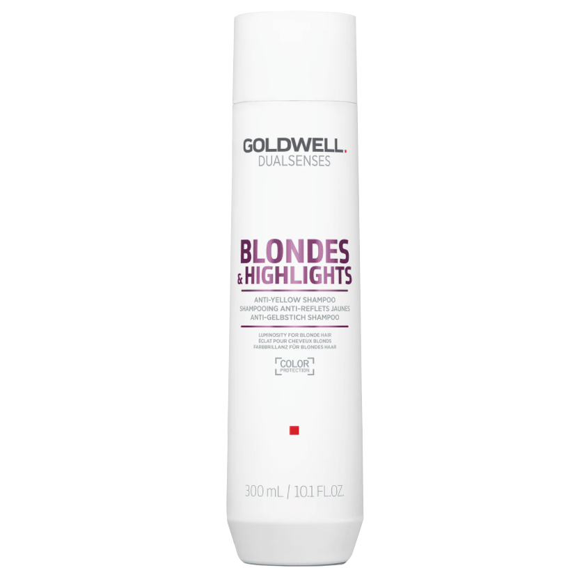 GOLDWELL Dualsenses Blonde & Highlights Anti Yellow Shampoo instantly brings out color luminosity and neutralized unwanted yellow tones for blonde color reflections.  As gentle as water, the unique FadeStopFormula minimized color fading with every use.