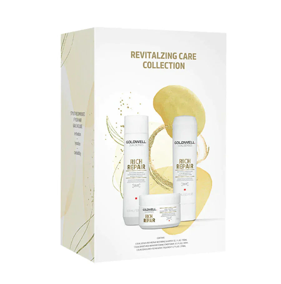 - Goldwell Dualsenses Rich Repair Holiday Pack contains multiple products to help repair and restore the hair at once.