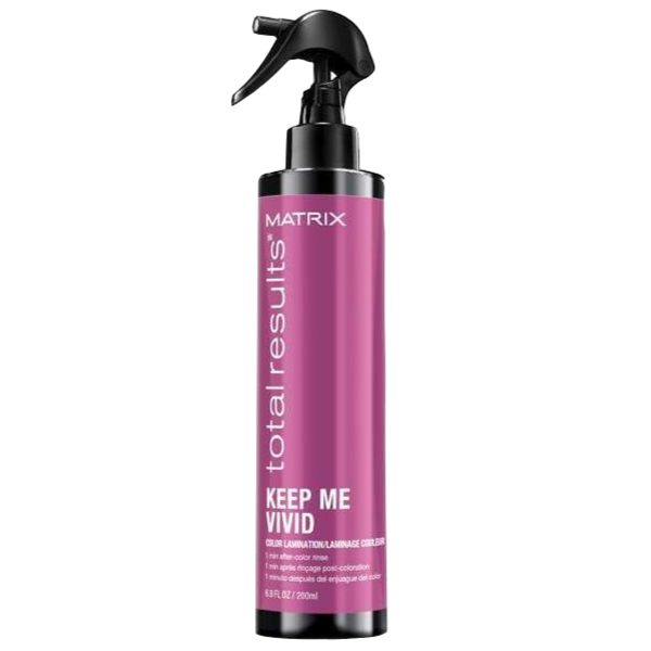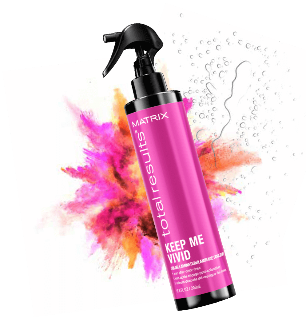 MATRIX Total Results Keep Me Vivid Color Lamination Spray will help seal in colour at home. Add it to your hair care routine a few times a week. Use MATRIX Total Results Keep Me Vivid Color Shampoo and rinse, apply MATRIX Total Results Keep Me Vivid Color Lamination Spray on full head and wait 1 minute, layer on MATRIX Total Results Keep Me Vivid Color Conditioner and thoroughly rinse. Use the MATRIX Total Results Keep Me Vivid Color Velvetizer before air-dry or blow-dry styling.